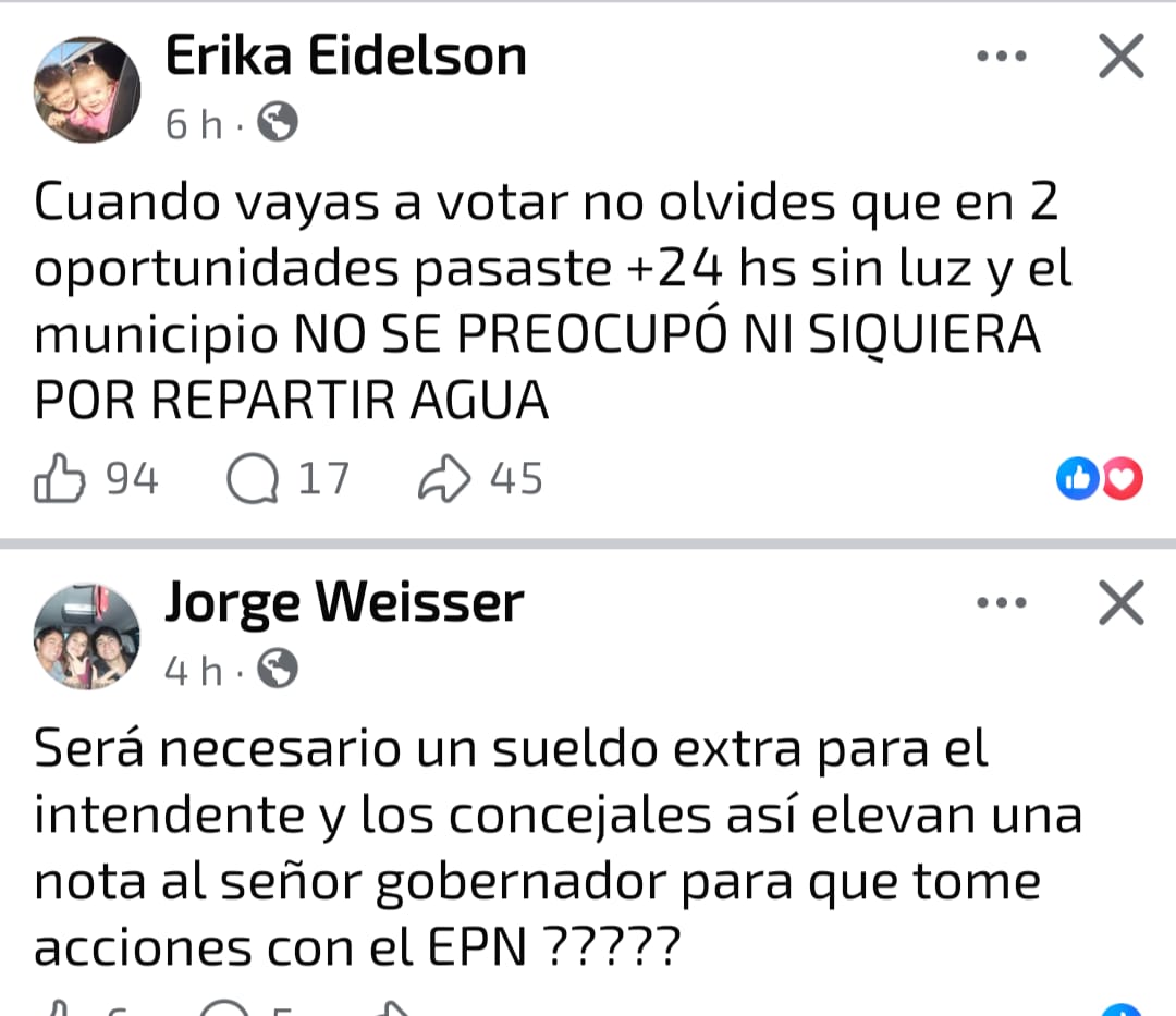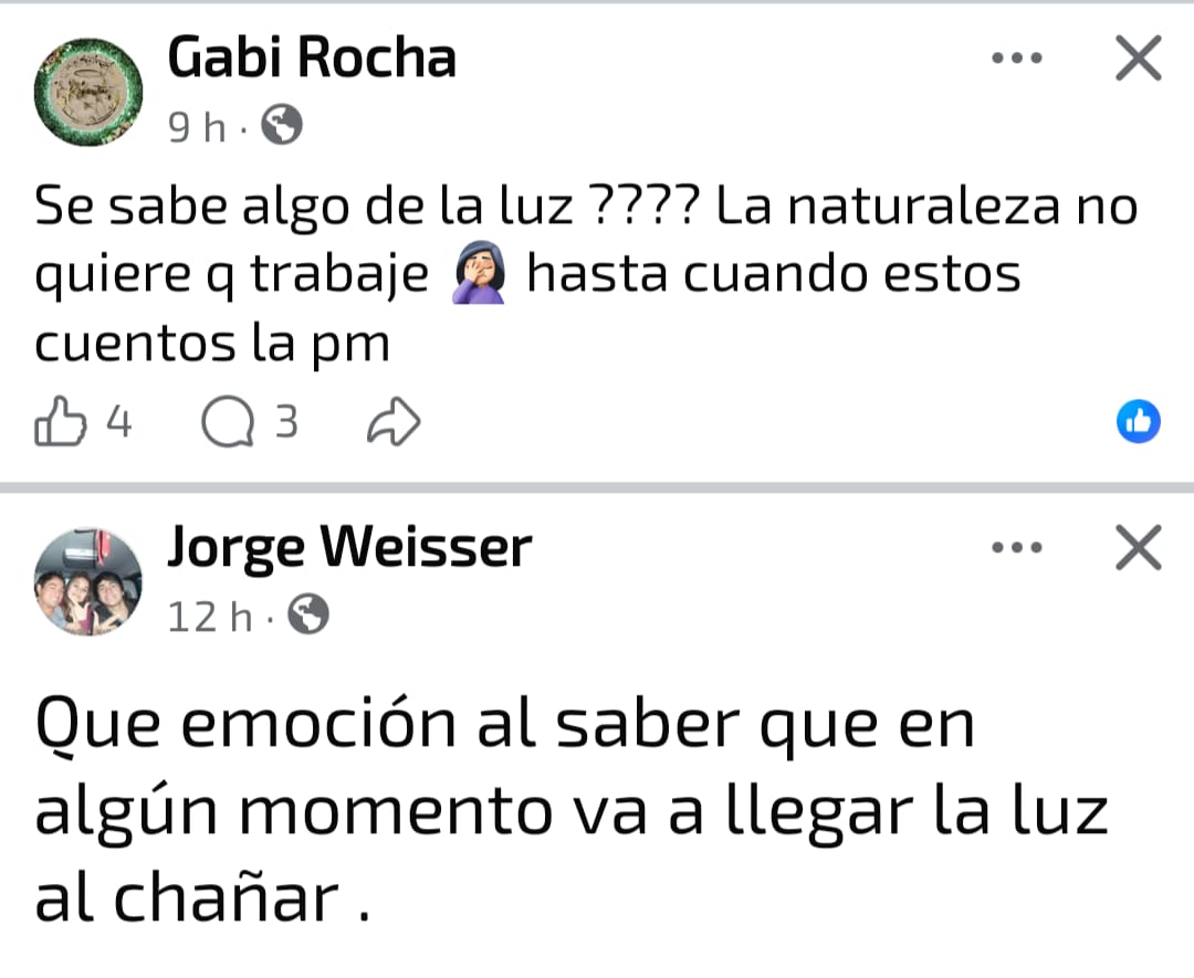 Otros vecinos manifestaron su desesperación ante la imposibilidad de organizar su día a día sin saber cuándo volvería la luz. También hubo quienes apelaron al humor y la ironía para sobrellevar la situación, compartiendo memes y comentarios que reflejan el cansancio colectivo.